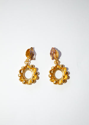 Vintage gold-tone drop earrings accented with faux pearls. Sculptural circular design with a softly hammered texture. Clip-on.