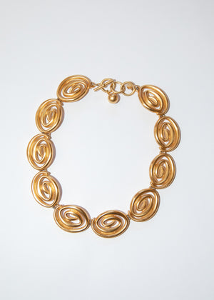 Vintage Anne Klein gold statement necklace with oval sculptural swirl links. Iconic 1980s design in brushed gold with adjustable toggle clasp.