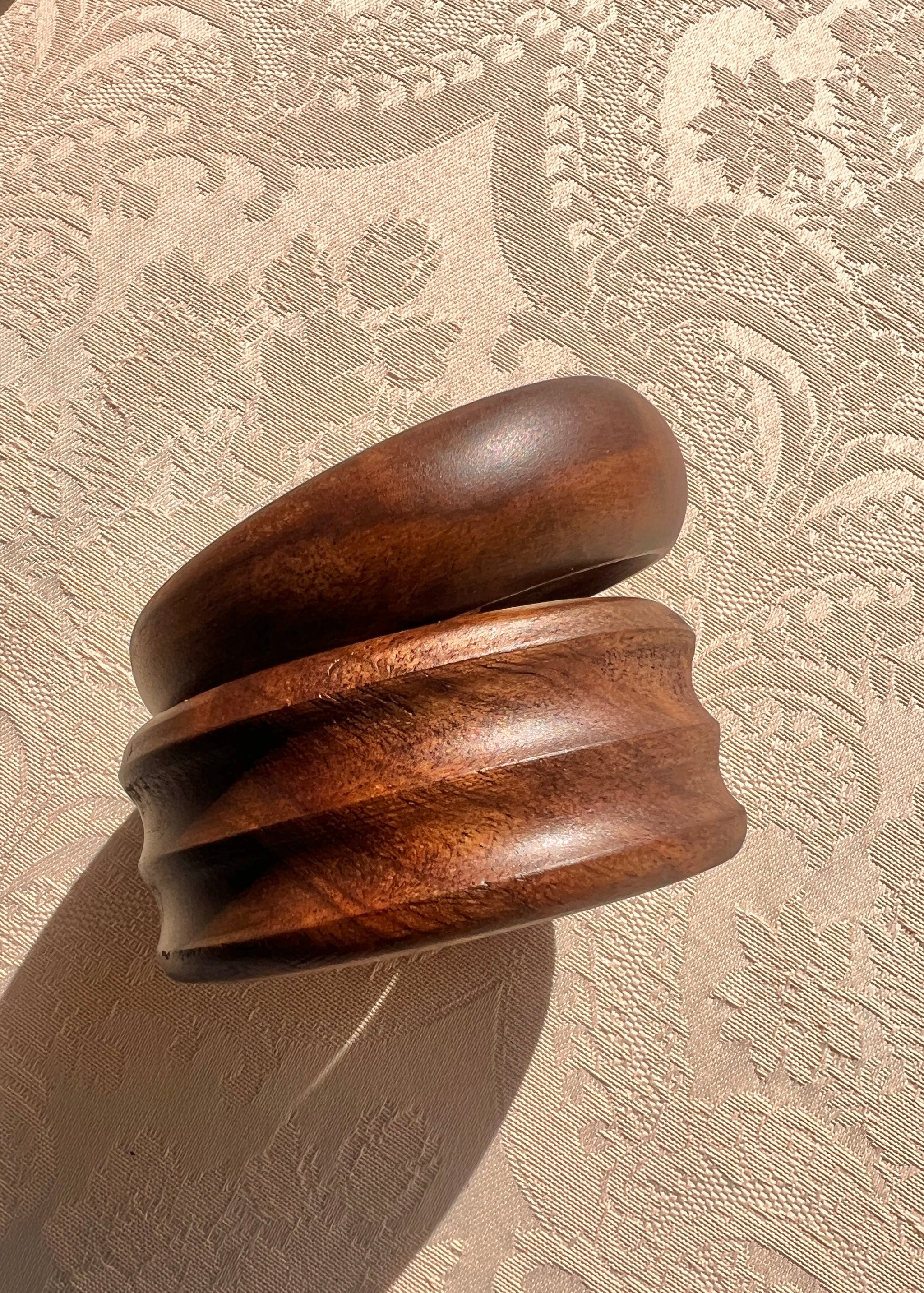 Hand-carved walnut burl wood bangles by Spanish artist Marvin Freitas. Sculptural, organic, and one of a kind. Sold as pair.