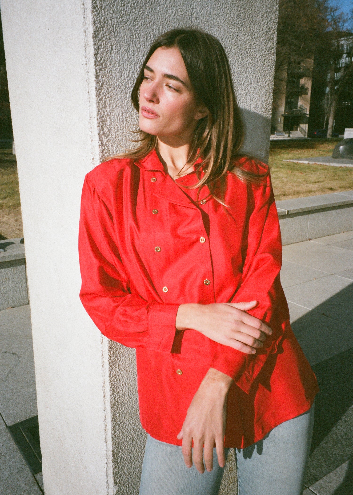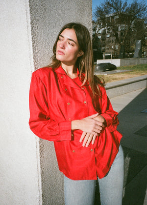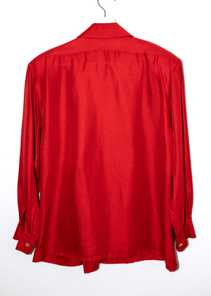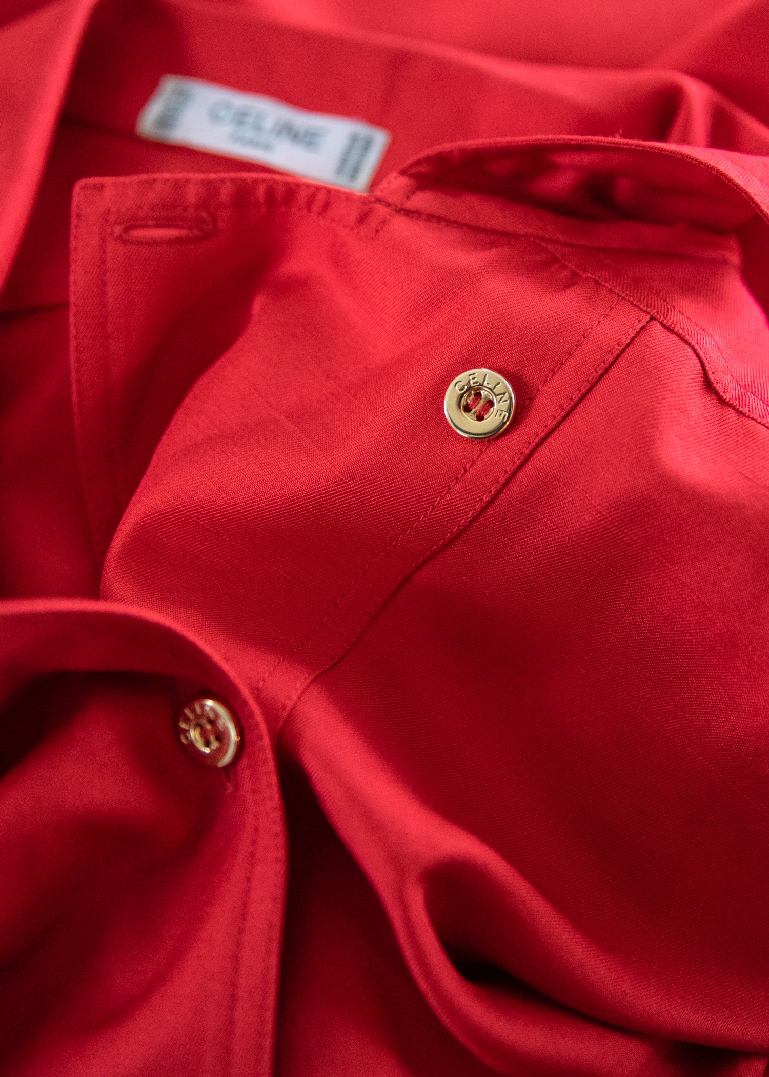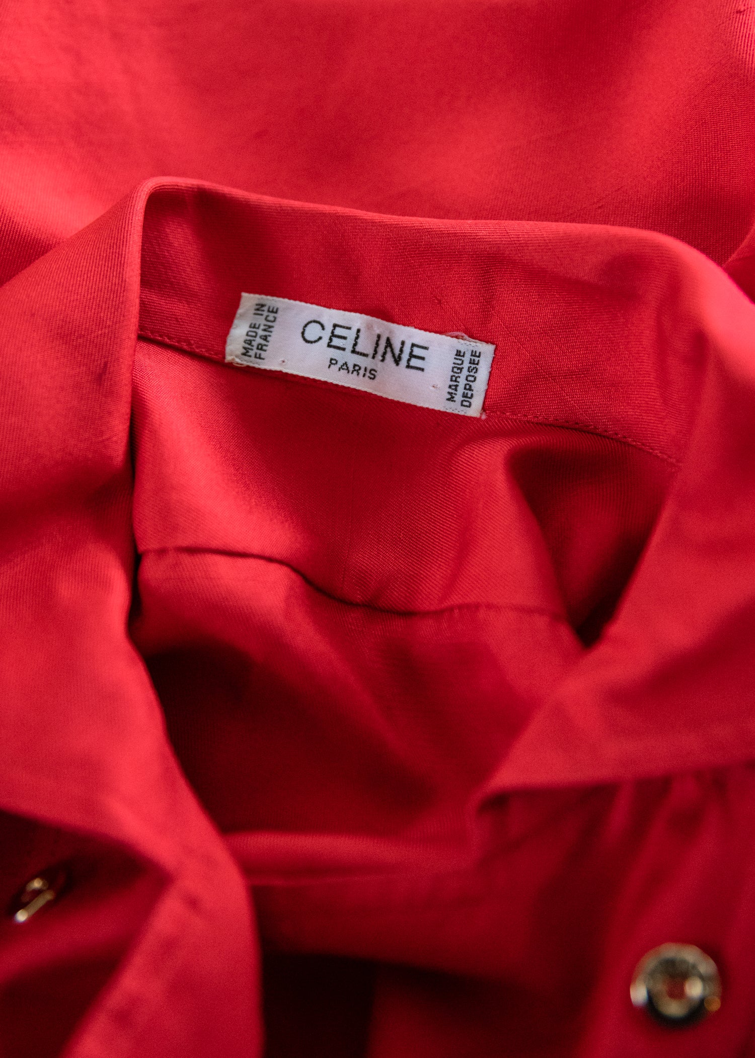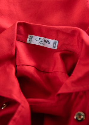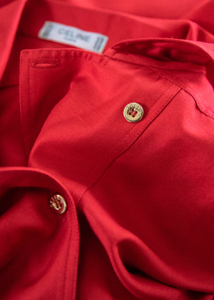 Striking vintage Celine from the 1980s. Vivid red silk blouse with signature gold buttons and structured shoulder pads. Subtly textured silk. Effortless drape, timeless French sophistication, and that iconic Celine polish.