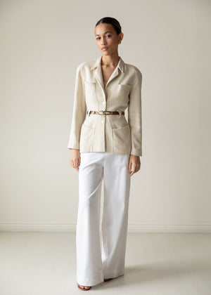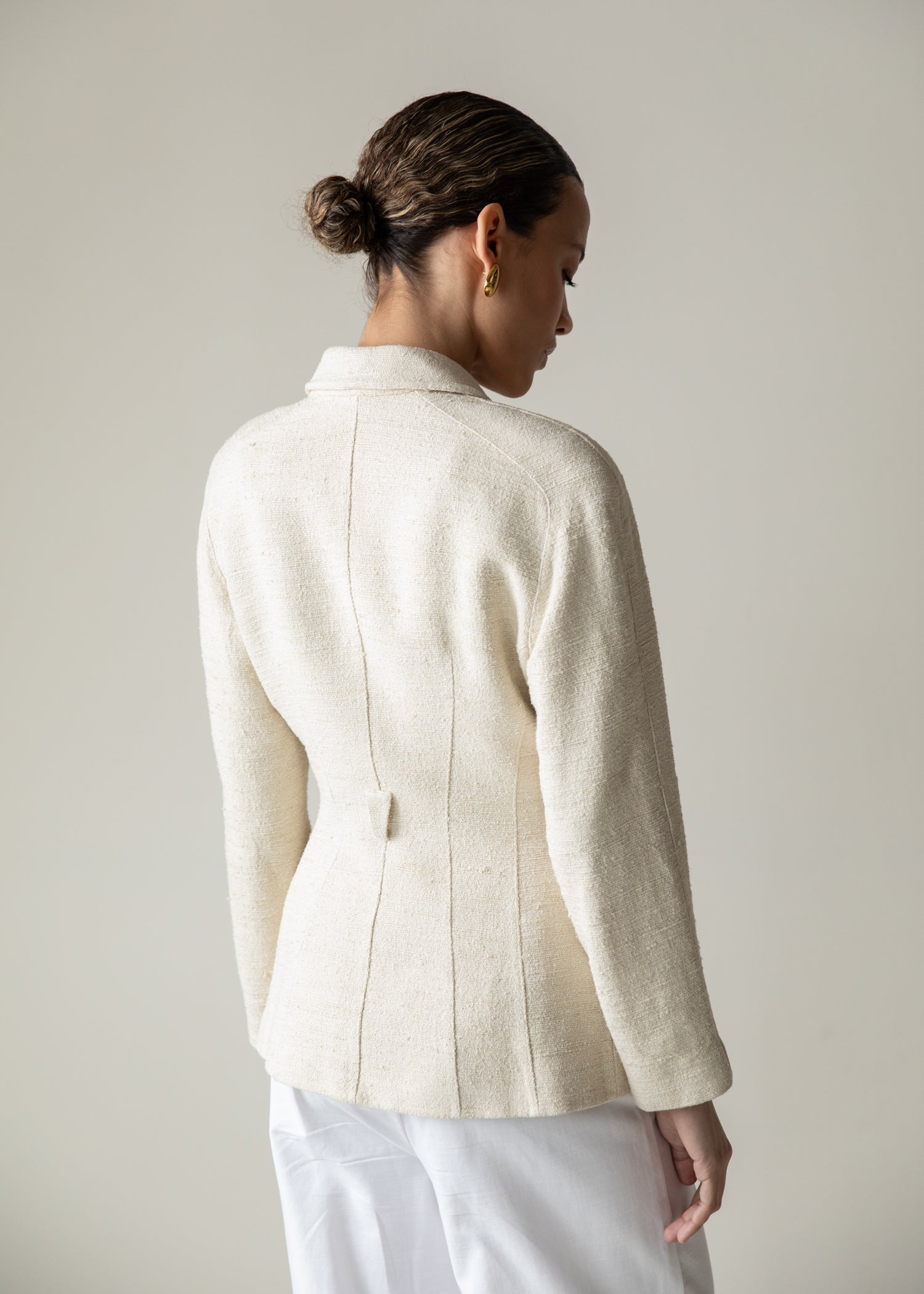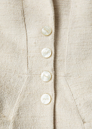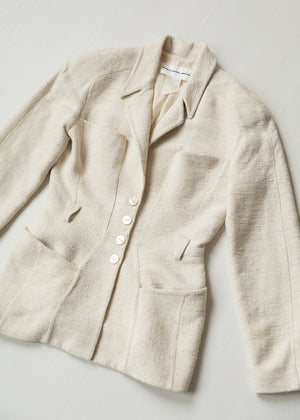 Structured vintage Mugler jacket in a refined cream textured raw silk fabric. Features a sculpted silhouette, sharp tailoring, and signature button detailing. Elegant, architectural, and one of a kind. Does not come with belt.