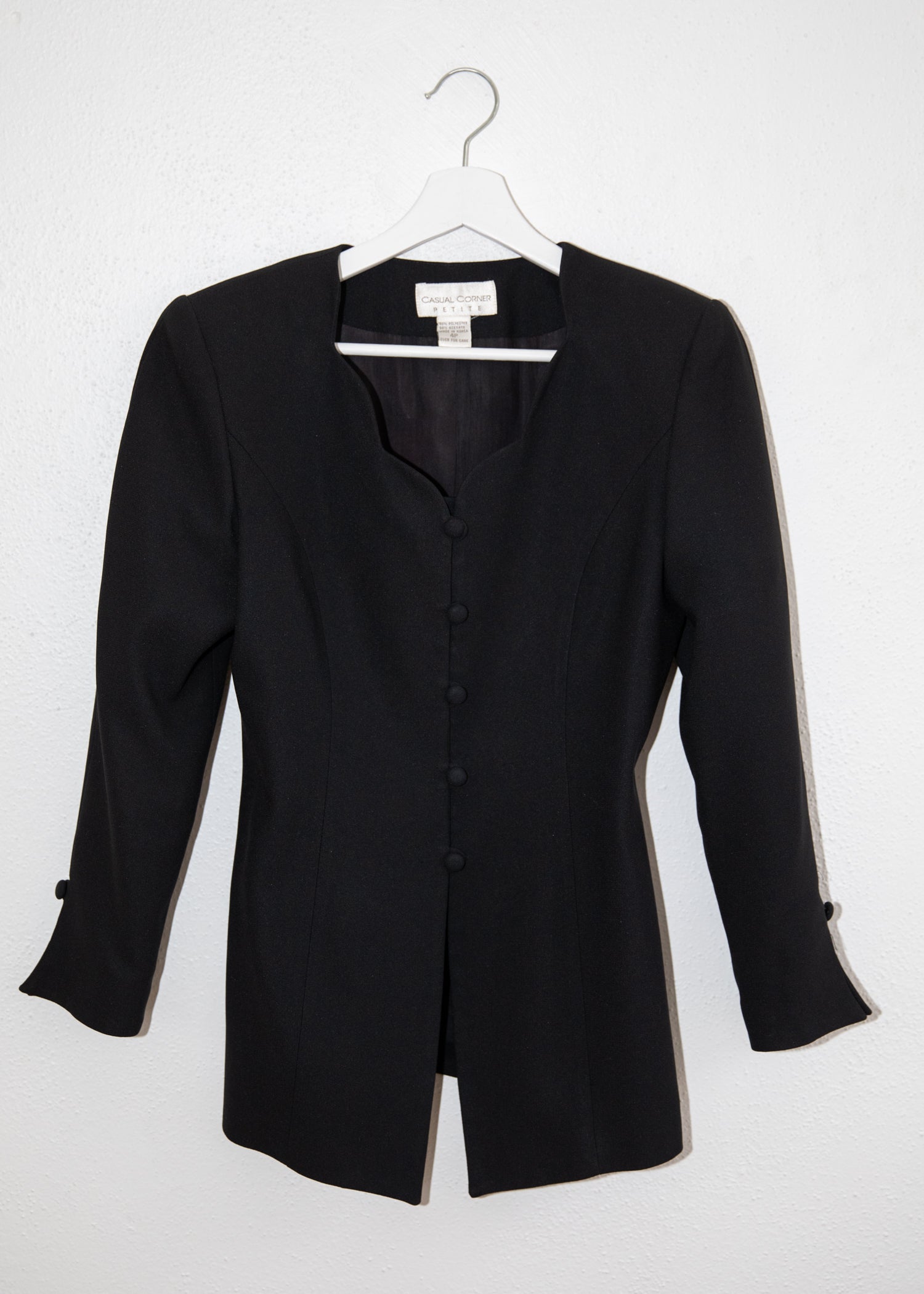 A refined vintage blazer with a sculptural scalloped neckline, covered buttons, and a clean, elongated silhouette. Minimal, modern, and quietly striking. Fully lined.