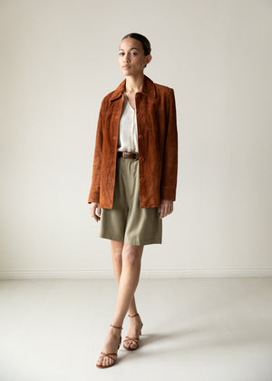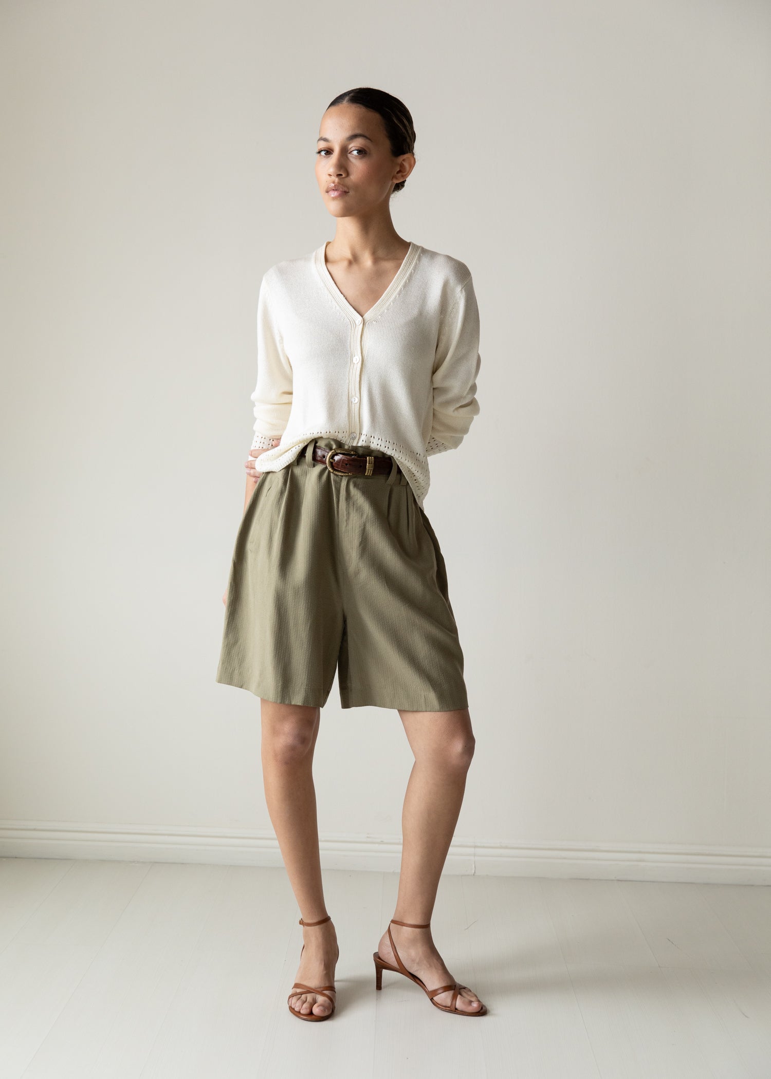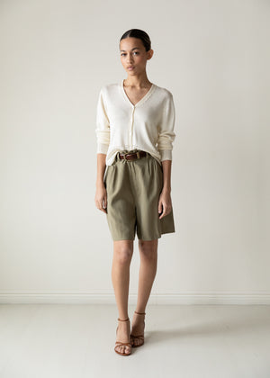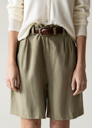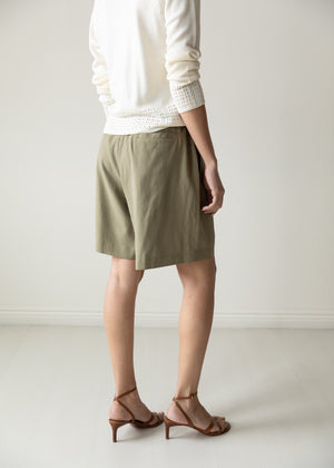 Vintage silk shorts in a soft olive tone. High waist pleated with a relaxed silhouette. Fluid drape and subtle texture. Lightweight, effortless, and easy to style. Worn oversized and belted on model.