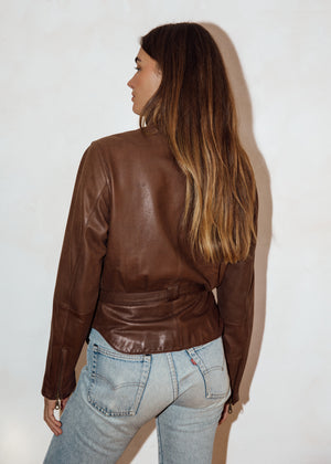 This vintage brown leather jacket is crafted from exceptionally soft leather with a natural drape and an easy, lived-in feel. The curved hem adds subtle shape, while the tie-waist belt lets you cinch it for a more defined silhouette. Fully Lined.