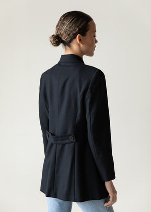 Sculpted black wool vintage jacket with a sharp double-breasted cut, structured shoulders, and subtle waist shaping. Timeless, minimal, and effortlessly chic. Fully lined. Does not come with pin.