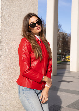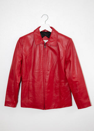 A striking vintage red leather jacket with a clean zip-front closure, butter-soft feel, and subtle shaping seams. Bold, modern, and effortlessly wearable. Fully Lined.